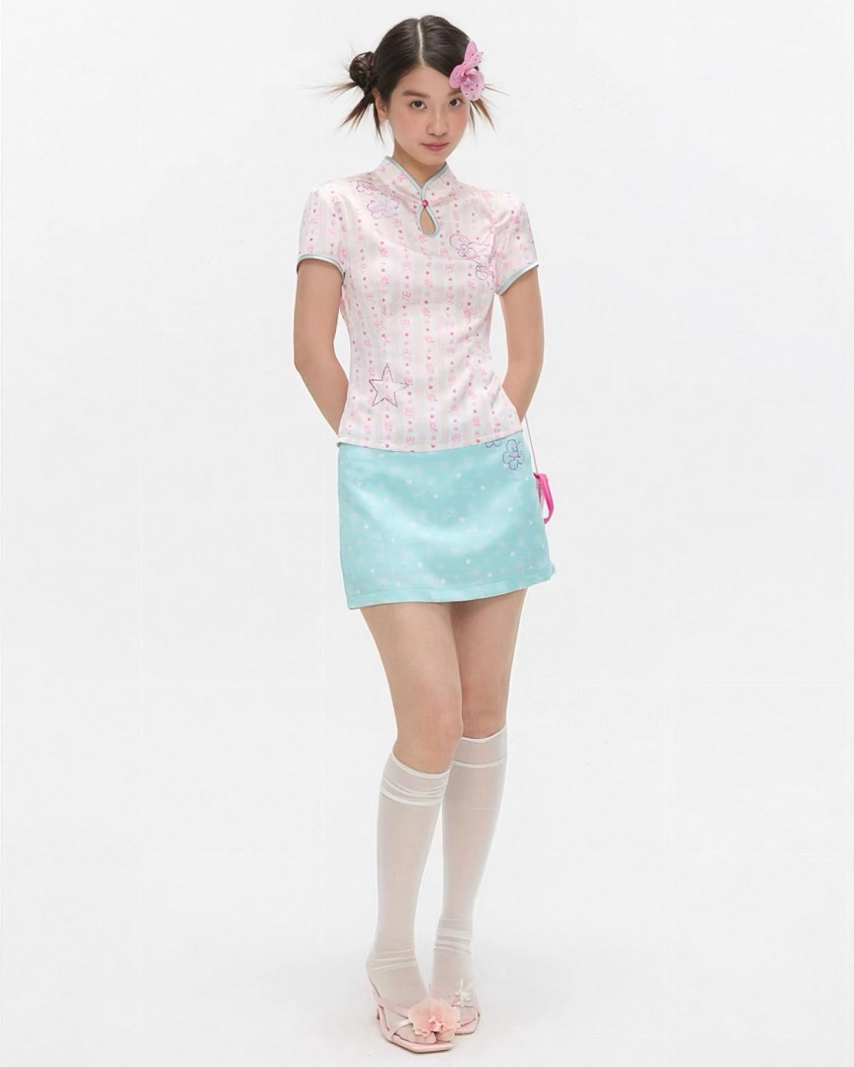 This sweet two-piece outfit features a stand neck short-sleeve top and a matching bodycon mini skirt with a playful print. Perfect for summer days, it blends comfort and traditional style in a flattering silhouette.